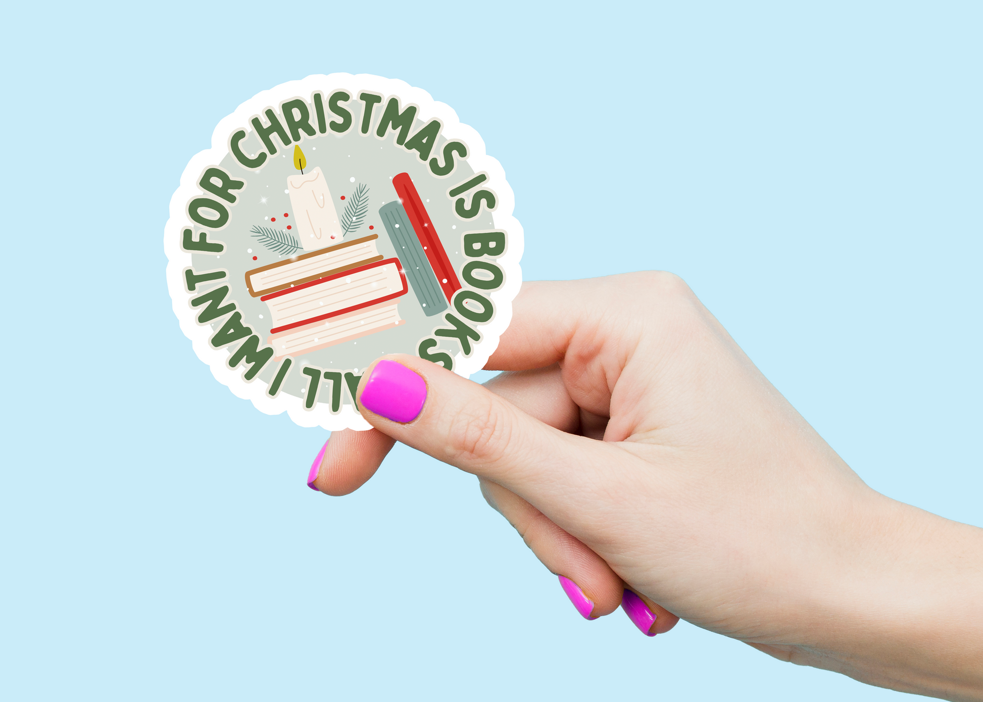 For the reader whose holiday list is all titles and tomes, the "All I Want for Christmas is Books" sticker is your kindred adornment. Crafted upon order, each sticker is ready to ship in 3-5 business days. © Jibbly 2025.